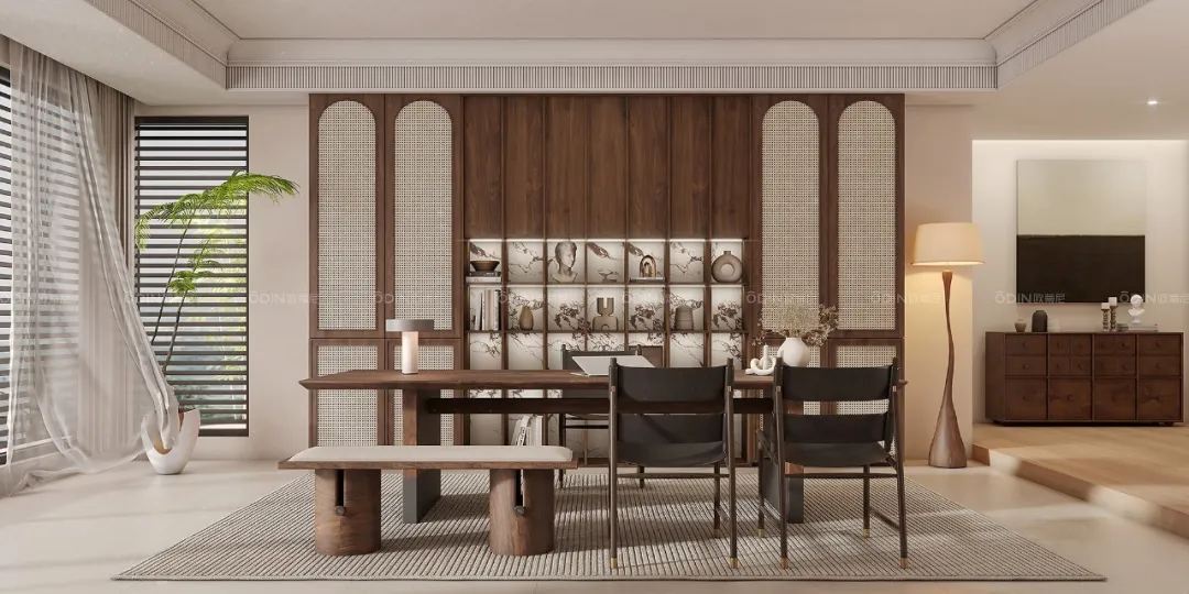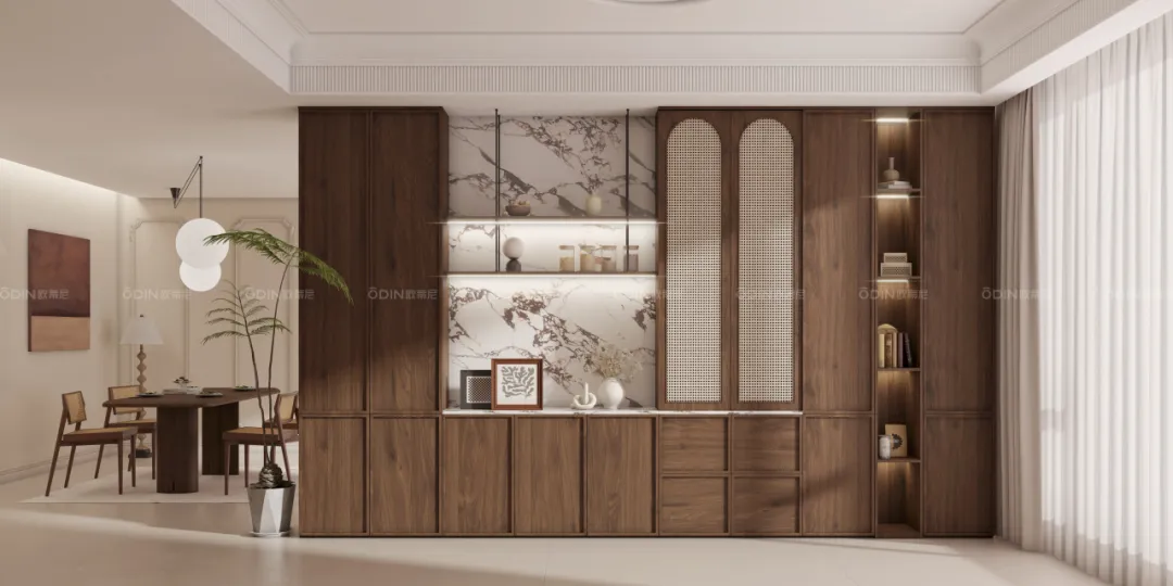 搭配經(jīng)典胡桃色,讓柜體的色彩沉穩(wěn)而不失高級(jí)。胡桃色的溫暖與復(fù)古,與藤編元素的自然古樸相得益彰,營造出濃厚的復(fù)古氛圍。無論是放在客廳、餐廳還是書房,都能成為一道亮麗的風(fēng)景線。