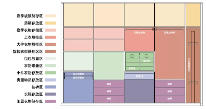 這類的整理區(qū)通常布置在最頂部,多用來放置換季的棉被等大件物品。若平時要放置的被褥較多,那么被褥區(qū)就要多設(shè)計一些。
