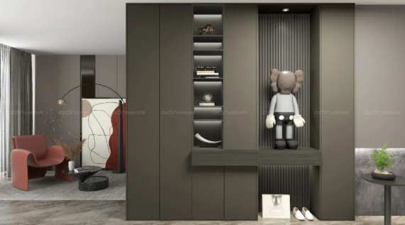 卡其灰門板與深色格柵板搭配,幾何體塊交錯重疊呈現,讓藝術在空間里逐光喚影。簡與繁,深與淺,高品質的生活就此開始。