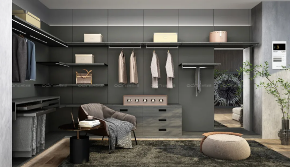 通頂落地式衣柜,頂面與房頂齊平,底部與地面無縫連接,充分利用有限的空間面積,讓收納功能達到最大化。