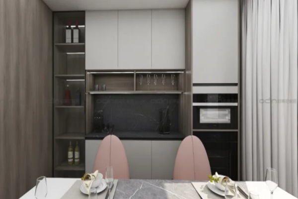 【設(shè)計(jì)說明】本案以極致簡約風(fēng)格為基礎(chǔ),通過一些精致的軟裝元素來凸顯質(zhì)感,從中彰顯了一種高品質(zhì)的生活方式。整體以白色為基調(diào),為空間勾畫出簡潔大氣的韻味。倚墻而放的L型布藝沙發(fā)寬大而舒適,素雅的沙色色調(diào)與深色吧臺(tái)設(shè)計(jì)形成分明對比,打造出至精至雅、簡潔大方的視覺效果。